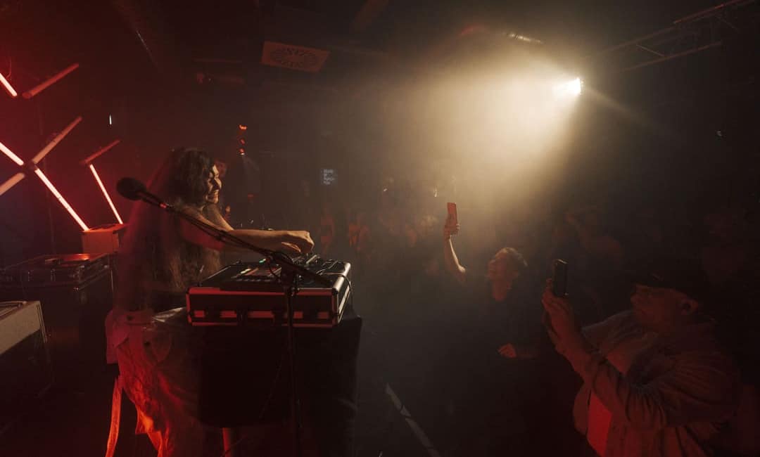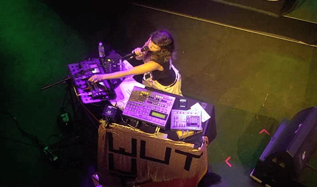 Ich performe komplett ohne Laptop – auf Drummachine, Sampler, Bass-Synth und Effektgeräten. Alles passiert live: Ich spiele, schichte und verändere Sounds in Echtzeit, ergänzt durch geloopte Vocal-Layer und improvisierte Elemente.